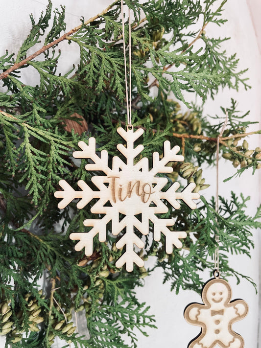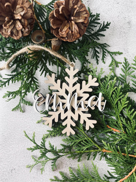 Personalisierter Weihnachtsbaumanhänger – Schneeflocke aus Holz