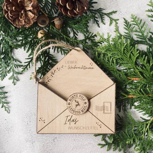 Personalisierter Weihnachtsbaumanhänger – Briefumschlag aus Holz für den Wunschzettel 3D